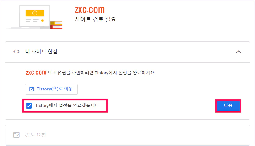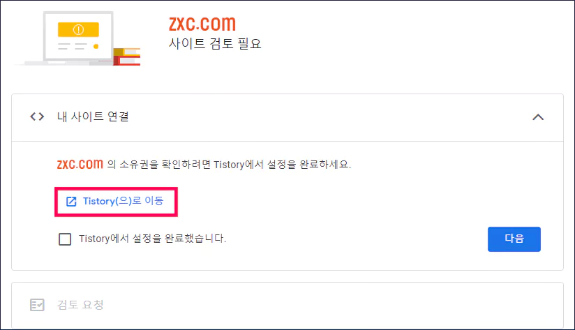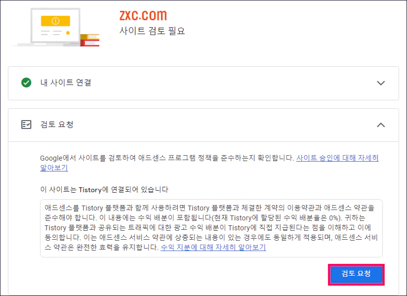 2. 이제 마지막 단계 내가 신청한 블로그주소 또는 도메인주소에 대한 사이트 "검토 요청"을 합니다.