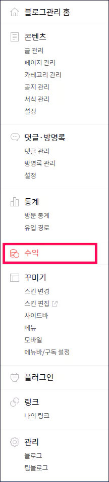 1. 애드센스 신청을 하려는 내 티스토리 블로그의 관리 화면으로 이동 후 메뉴에서 "수익"을 클릭합니다.