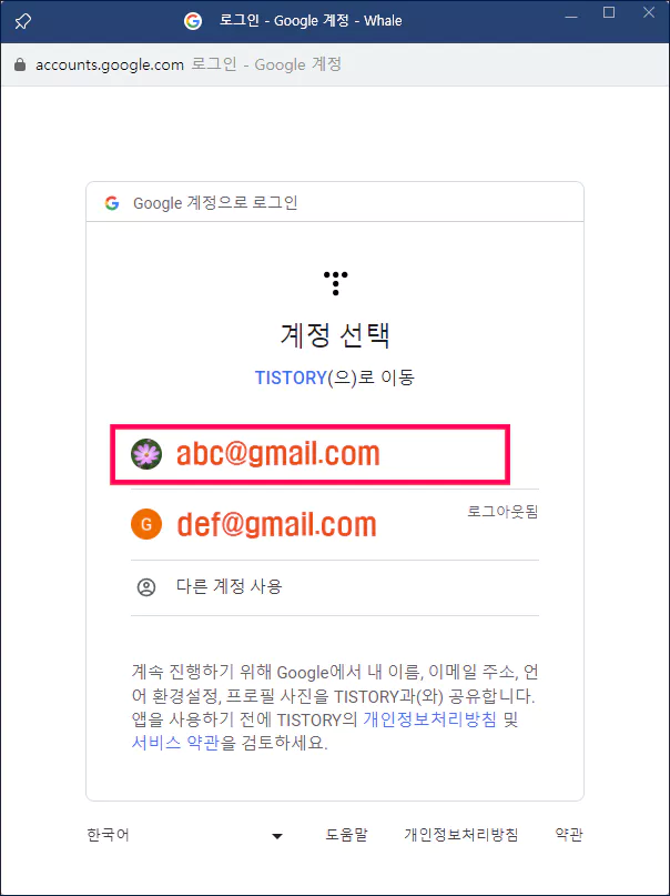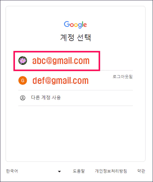 3. 자신의 구글 계정을 선택합니다. 없다면 간단한 회원가입 후 로그인 하시면 됩니다.