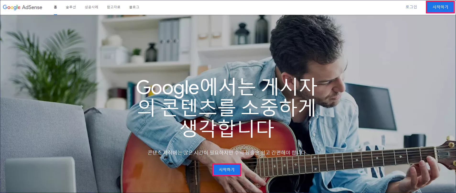 2. Google Adsense 홈페이지에서 "시작하기"를 클릭합니다.