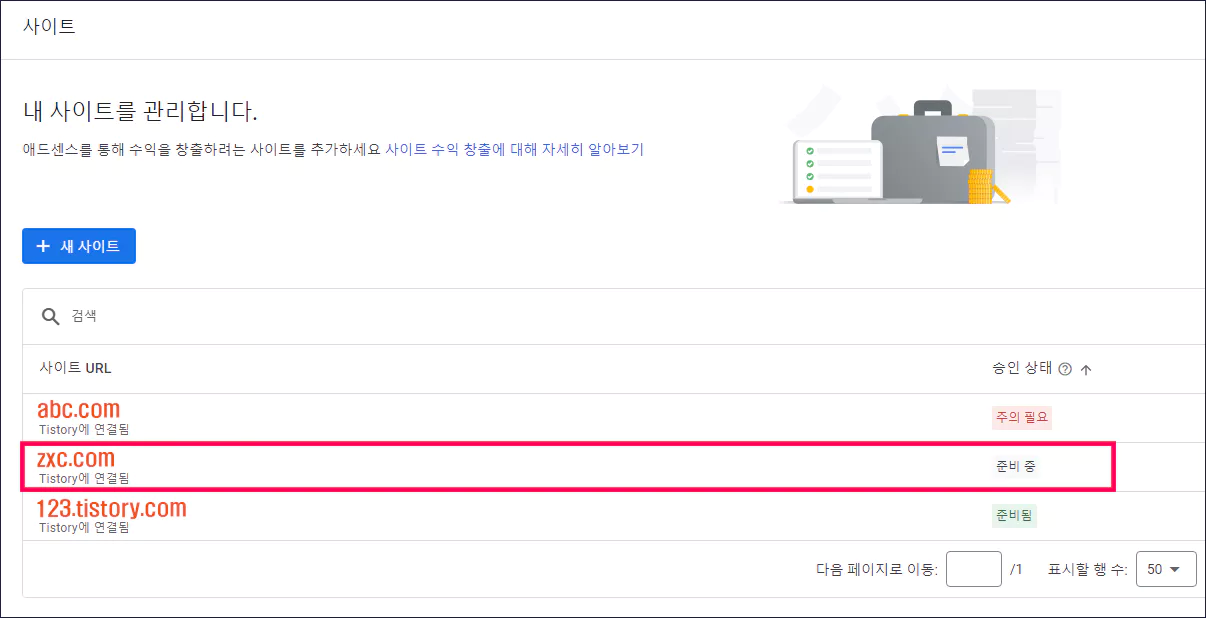 4. 구글 애드센스 메인화면에서 사이트를 클릭하면 아래와 같이 신청한 사이트 주소가 나오고 우측 편 승인상태에 준비 중이라고 표시됩니다.