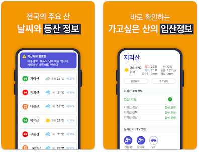 이 앱은 여러분이 가고 싶은 산의 날씨와 등산 통제 여부를 확인할 수 있는 것은 물론 각 산에 설치된 CCTV로 실시간 산의 영상을 즉시 확인하여 더욱 정확한 등산 계획을 세울 수 있게 해 줍니다.