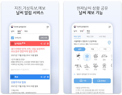 현재 날씨뿐만 아니라 일기예보와 함께 지진, 기상특보 등의 위험기상 정보도 실시간으로 제공받을 수 있고 사용자는 언제든지 앱을 통해 위험기상에 대한 상세한 정보를 확인할 수 있습니다.