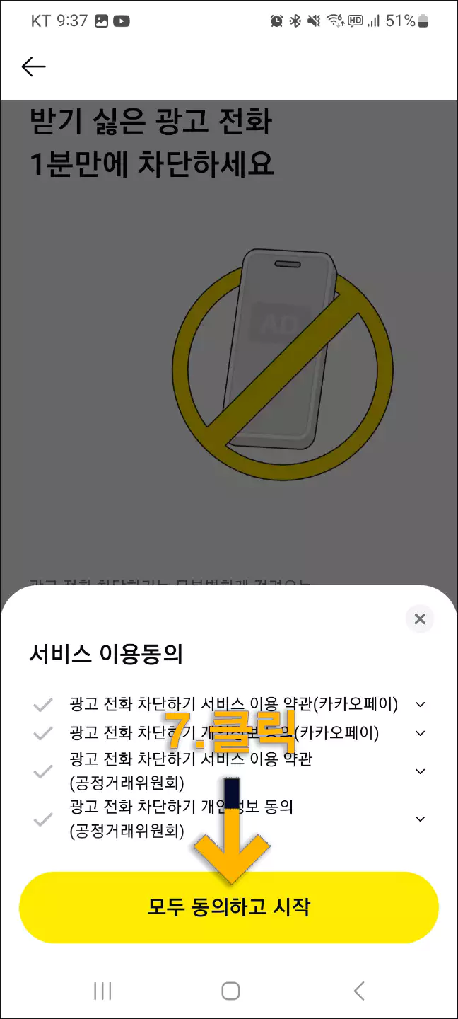 "모두 동의하고 시작"을 클릭합니다. 선택사항 없고 모두 동의해야 광고전화 차단이 가능합니다.