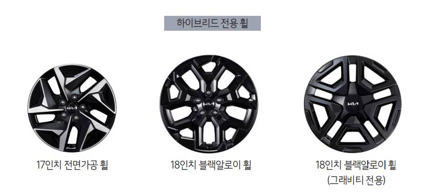 쏘렌토 하이브리드 외관 색상은 총 5종(스노우 화이트 펄 / 볼캐닉 샌드 브라운 / 시티스케이프 그린 / 인터스텔라 그레이 / 오로라 블랙 펄)으로 준비되어 있고 실내 색상은 3종(올리브 브라운 / 블랙 / 네이비 그레이)이며 휠은 하이브리드 전용 휠로 '17인치 전면가공 휠 / 18인치 블랙 알로이 휠 / 그래비티 전용 18인치 블랙 알로이 휠'로 되어 있습니다.