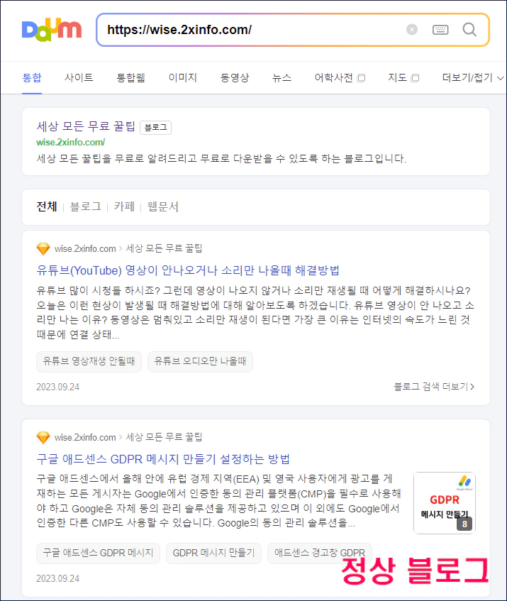 1. 내 블로그 전체 주소를 복사한 뒤 Daum 검색창에 붙여 넣고 검색을 해봅니다.