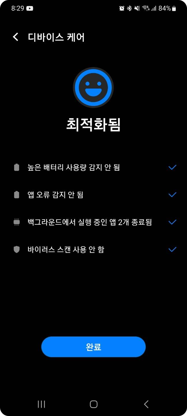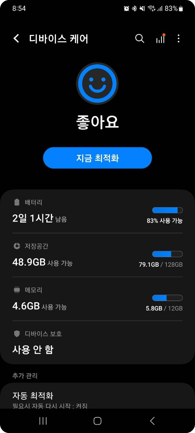 1)톱니바퀴 > 2)베터리 및 디바이스 케어 > 3)지금 최적화 > 4)완료