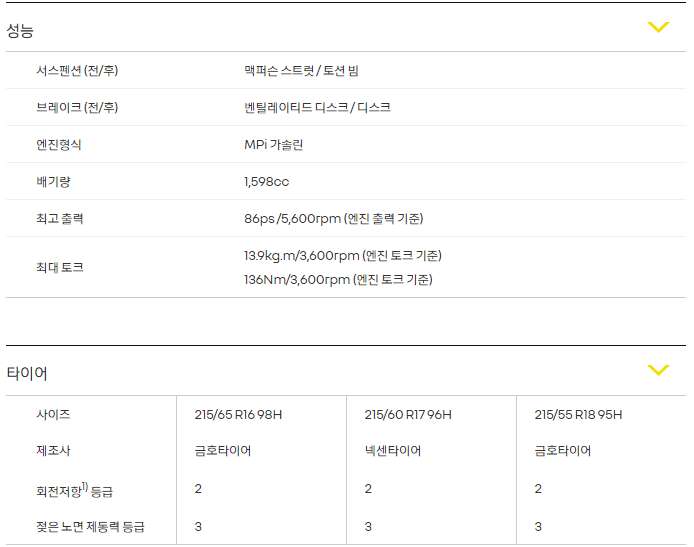 타이어: 215/65 R16 98H 금호타이어 / 215/60 R17 96H 넥센타이어 / 215/55 R18 95H 금호타이어
